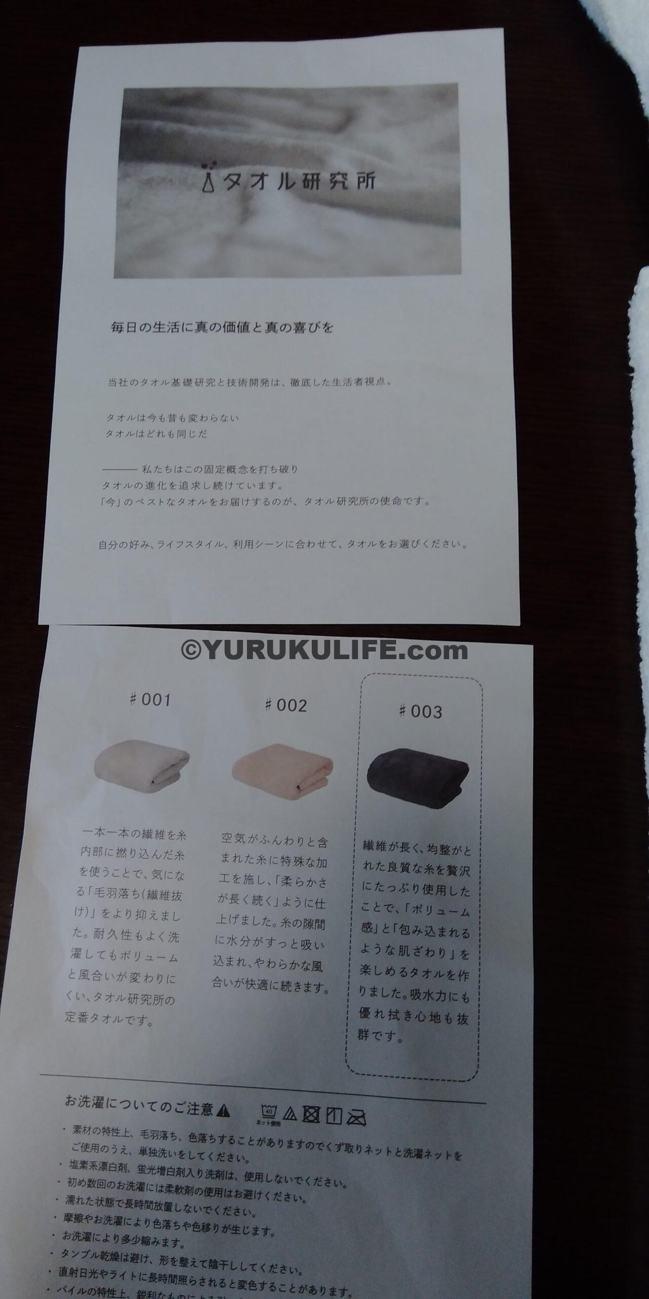 タオルは、001から、3種類あります。違いはよくわかりませんが、肌触りや毛羽立ち間、ボリュームなど自分スタイルのタオルが選べます。